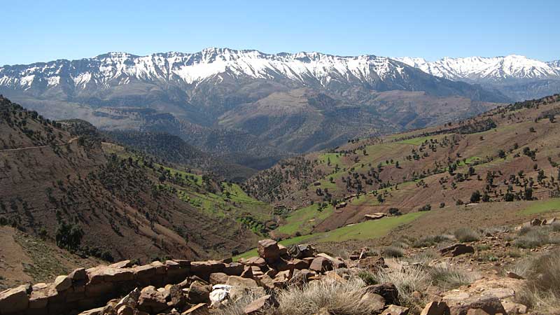 Transfer Azilal, the last town before taking a small road to the deep valleys of the central High Atlas valley Ait Abbas and happy Bougmez valley with its first village we meet Agouti with the mule team. Our trek begins with M'goun crossing the beautiful Berber villages in the Arous valley with typical adobe architecture. Overnight in tents near sheepfolds Arous 2200 m . 3 hour walk