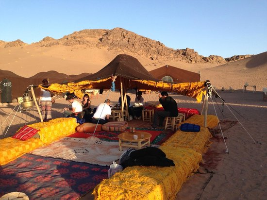 First we cross the spectacular Tizi n’Tichka Pass of the High Atlas mountains. You will pass through many Berber villages, and once in the desert, riverside oasis and barren hillsides are clustered with Kasbahs. After lunch we drive further to Zagora, with beautiful views of the Draa Valley. We will arrive there around 4 and after a short break you will ride camels into the dunes, where you will spend the night in Berber tents. After seeing a beautiful sunset you will enjoy a fantastic dinner.